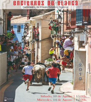 El cartel anunciador de los Encierros de Blanca, declarados de Interés Turístico Regional, es una fotografía del blanqueño Frutos Molina, que refleja el momento de emoción que se vive por los espectadores mientras las reses hacen su paso en la calle Concepción.