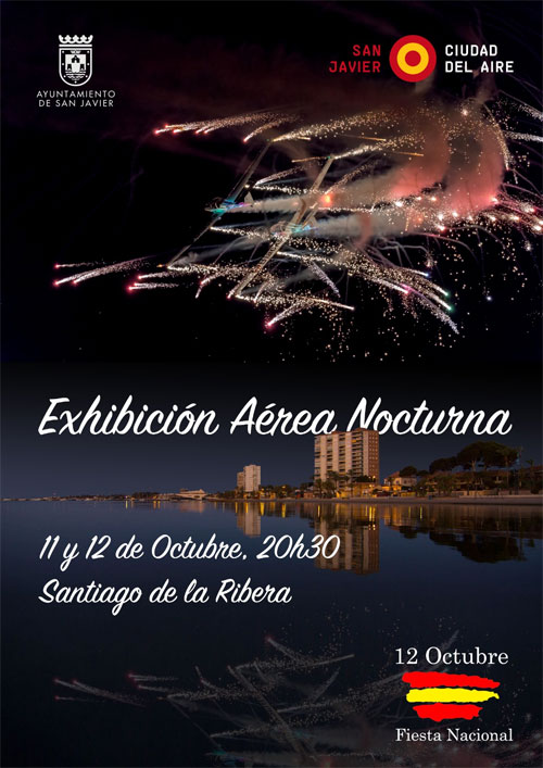 Santiago de la Ribera acogerá una novedosa Exhibición Aérea Nocturna el próximo 12 de octubre a las 20:30h, coincidiendo con la celebración del Día de la Fiesta Nacional y enmarcada en el proyecto municipal "San Javier, ciudad del aire" que tiene como objetivo impulsar la marca ciudad en la que se trabaja desde el Gobierno local para convertir al municipio en referente de la cultura aeronáutica.