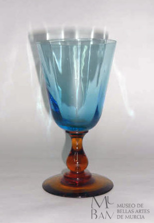 Copa de vidrio bicolor translúcido, en color azul el depósito y tono melado la pierna y el pie. Para su fabricación se utilizó la técnica del soplado a molde fijo y trabajado al puntil, presentando algunas imperfecciones, como vemos en las pequeñas pompas en la pasta.
