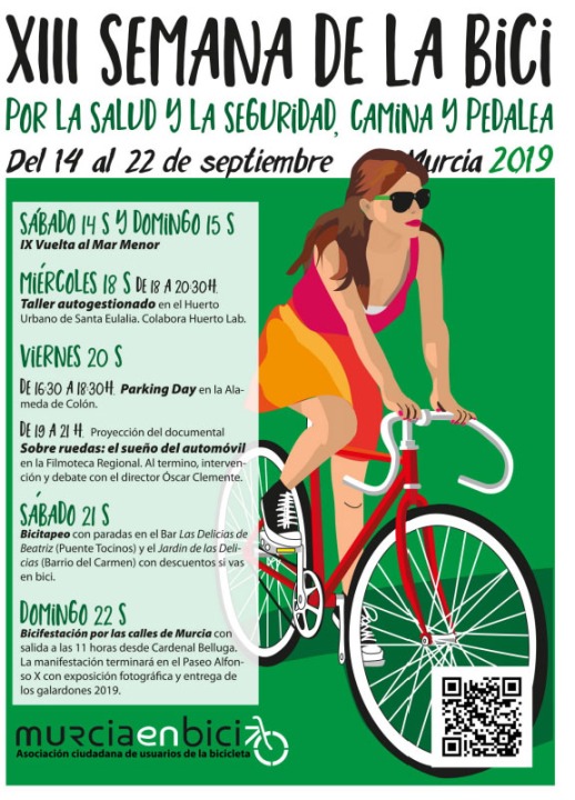 Ante el inminente inicio de la Semana Europea de la Movilidad, a la que se suman gran cantidad de ciudades españolas, incluida nuestra localidad, Murcia en Bici informa de la convocatoria de su XIII SEMANA DE LA BICICLETA que se desarrollara del MIÉRCOLES 18 de septiembre hasta el DOMINGO 22 de septiembre de 2019.