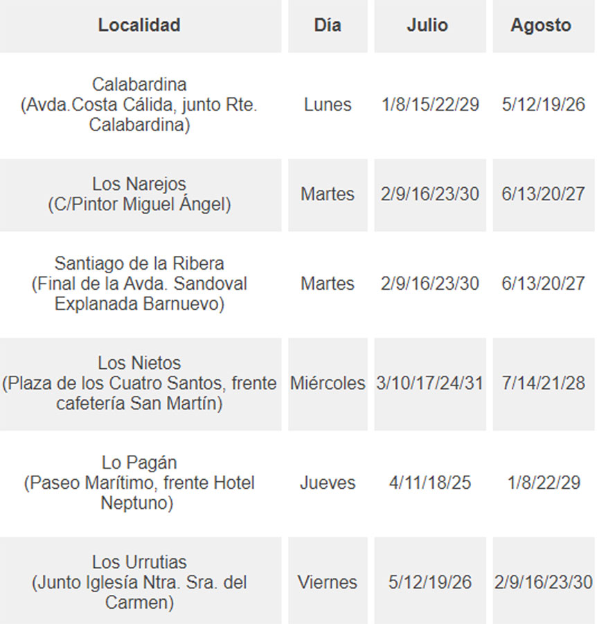 En concreto, los lunes aparcarán en Calabardina (avenida Costa Cálida); los martes en Los Narejos (calle Pintor Miguel Ángel) y en Santiago de la Ribera (explanada Barnuevo), y los miércoles en Los Nietos (plaza de los Cuatro Santos), Benizar (avenida Teleclub) y Corvera (Centro Cultural).
