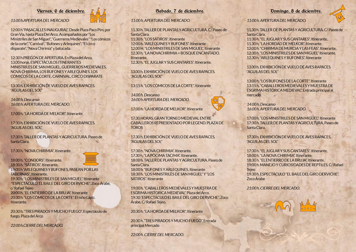 El XVI Mercado Medieval abrirá sus puertas el viernes 6 de diciembre, con el pasacalles inaugural, que se iniciará a las 12 horas desde Plaza Paco Pim, amenizado por diversos grupos musicales y de animación, para finalizar en la Plaza del Arco con el ya tradicional pregón de apertura.