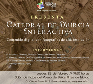Presentación de un nuevo contenido digital interactivo desarrollado para el Portal Región de Murcia Digital (www.regmurcia.com) en el que se han utilizado para su desarrollo avanzadas técnicas fotográficas e informáticas para la generación de imágenes de altísima resolución que permitirán a través de Internet contemplar con un alto nivel de detalle los principales elementos y espacios que forman parte de la Catedral de Murcia.