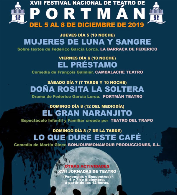 » El día 7 diciembre, a las 19.00 horas y a las 22.00 horas, “Portmán Teatro” de Murcia, con la obra “Doña Rosita La Soltera”, un drama de Federico García Lorca.