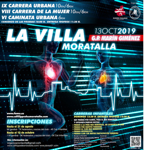 El domingo 13 de octubre se celebrará la IX Carrera Popular Urbana, VIII Carrera de la Mujer y VI Caminata en Ruta Urbana de Moratalla “LA VILLA G.P. Marín Giménez”, a partir de las 10:00h. para las citas absolutas, arrancando a partir de las 12:30h. las carreras infantiles, en todos los casos con salida y meta en el Parque Eugenio Ruiz de Amoraga.