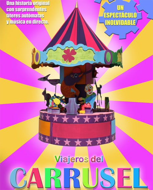 "Viajeros del carrusel" está inspirado en los personajes de la suite "El carnaval de los animales" de Camille Saint Saëns. Un divertido clown se adentra en el fantástico mundo de los carruseles; junto a él, más de una docena de coloridos personajes autómatas nos contarán pequeñas historias llenas de humor y emoción. Un espectáculo donde podemos deleitarnos con música en directo, además de los estímulos sensoriales que te invitarán a soñar y a viajar por un sorprendente mundo de fantasía.