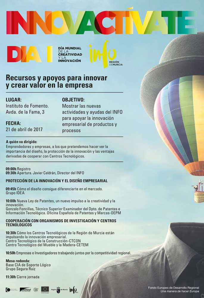 Así, el epicentro de la celebración del Día Mundial de la Creatividad será la jornada ‘InnoActívate’, en la que se mostrarán las actividades y ayudas del Info para apoyar la innovación empresarial de productos y procesos. A lo largo de la jornada, orientada a empresarios y emprendedores, habrá charlas y conferencias sobre la importancia del diseño como elemento de diferenciación en el mercado, se analizará la nueva Ley de Patentes, el papel de impulso a la innovación que desarrollan los centros tecnológicos de la Región, en concreto los centros de la Construcción y del Mueble y la Madera, y se estudiarán los beneficios para la competitividad regional que genera la colaboración de empresas e investigadores.