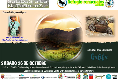 El sábado 26 de octubre tendrán lugar dos conferencias dentro de las I Jornadas de la Naturaleza Galifa 2019 en el Local Socio-Cultural. En ellas, se hablará sobre la fauna del Entorno Natural Protegido Sierra de la Muela, Cabo Tiñoso y Roldán.
