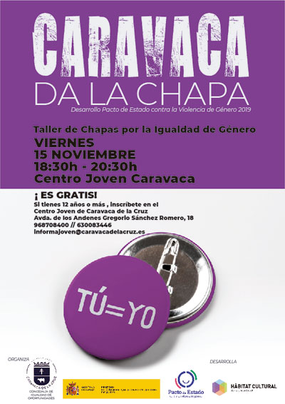 A través de las concejalías de Igualdad de Oportunidades y Juventud y dentro de las medidas contenidas en el Pacto de Estado de la Violencia de Género, se ha programado este taller práctico dirigido a los adolescentes, en el que realizarán actividades de sensibilización de una forma motivadora para ellos. Los participantes contarán con numerosos materiales para la creación de chapas e imanes, con consignas, lemas e imágenes a favor de la igualdad y los buenos tratos. Estas chapas creadas por los jóvenes se repartirán entre la población el 25 de noviembre.