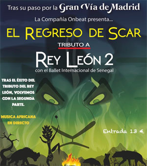 Tras el éxito de nuestro tributo del Rey León, la Compañía Onbeat regresa al Teatro Cine Velasco de Totana con ‘El regreso de Scar’, que aúna las impresionantes voces de Onbeat con el colorido y la espectacularidad del Ballet Internacional de Senegal.
