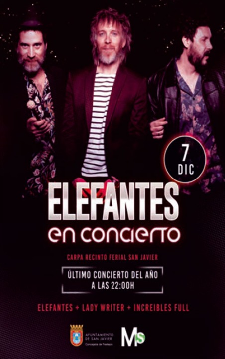 El grupo de pop rock ELEFANTES realizará una última parada en San Javier en su gira de presentación de su último trabajo, 'La primera luz del día', será el sábado 7 de diciembre en la carpa festera, donde los barceloneses estarán acompañados de INCREIBLES FULL, LADY WRITERS.