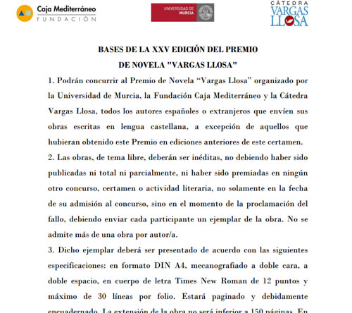La Universidad de Murcia, Fundación Caja Mediterráneo y la Cátedra Vargas Llosa han abierto el plazo de la convocatoria para participar en el XXV Premio de Novela Vargas Llosa, dotado con 12.000 euros. Las bases de este certamen se pueden consultar en las webs Universidad de Murcia y de la Fundación Caja Mediterráneo.