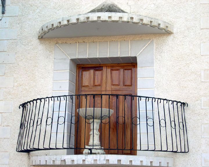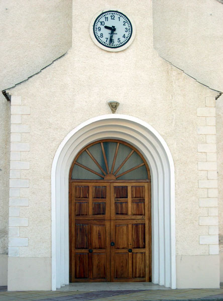 La puerta de acceso, de dos hojas en madera, se sitúa en el interior de varios arcos de medio punto que disminuyen de tamaño. Sobre ella se encuentra el reloj, y una decorada cruz en hierro forjado negro.