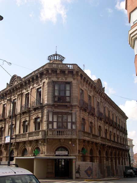 En la Calle Mayor del municipio de La Unión se levanta este edificio de fachada achaflanada que en su día intentó cubrir la demanda de viviendas de alquiler para familias de alto poder adquisitivo.