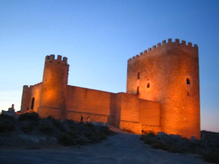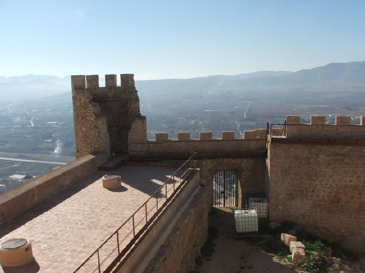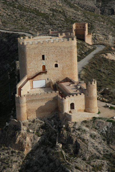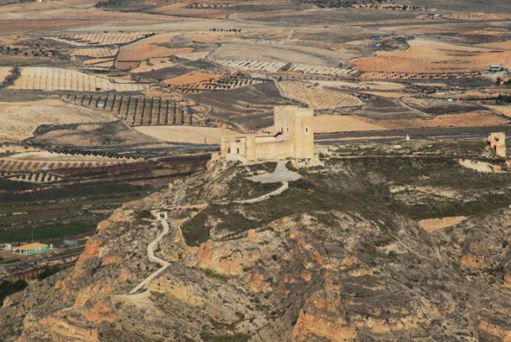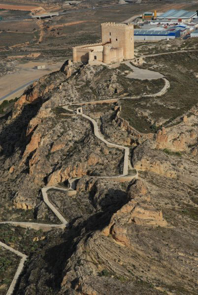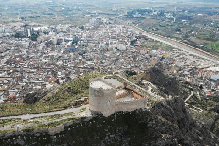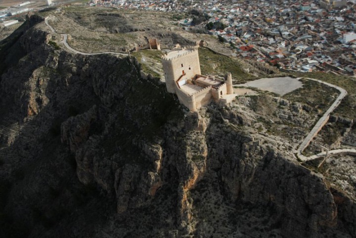 Vista aérea del Castillo de Jumilla con la ciudad al fondo