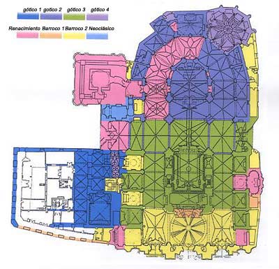 La girola se organiza en diez módulos de perímetro poligonal exterior, más dos tramos rectos; los módulos trapeciales externos de la girola se dividen en dos a efectos de formación de capillas. Aquellos paramentos en la dobladura de los muros permitió originariamente la aparición binaria de capillas en la girola, por lo que todas las que no se atienen a este esquema de dos fachadas en prolongación recta sin correspondencia con el desdoblado posterior en dos capillas (las del Corpus, la de los Vélez y la de los Medios Racioneros), corresponden a modificaciones realizadas sobre el esquema básico del templo primitivo.