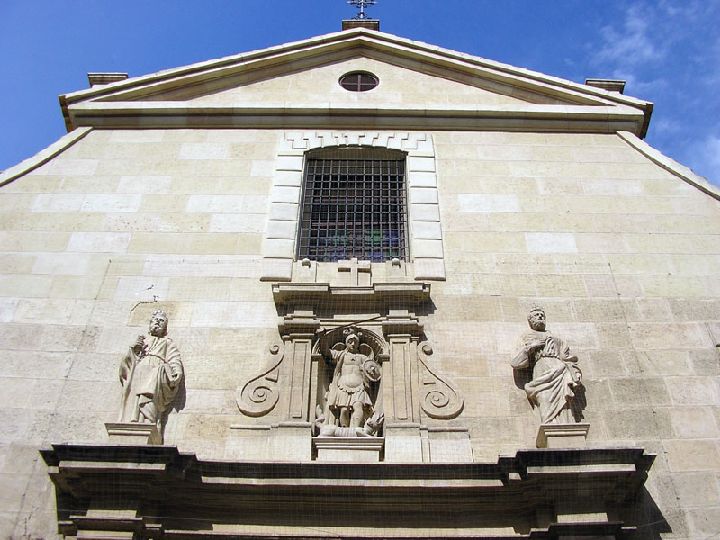 La fachada, muy alterada tras los sucesivos revocos que se le han ido añadiendo, presenta un acceso constituido por un arco de medio punto enmarcado entre pilastras de orden corintio adosadas al muro, con su correspondiente entablamento, a modo de un arco de triunfo. Sobre las pilastras aparecen dos imágenes que representan a San Pedro y a San Pablo, padres de la Iglesia, y que flanquean una hornacina con la imagen del titular de la iglesia, San Miguel Arcángel. En 1603 Pedro Monte hizo una nueva traza para levantar la iglesia de San Miguel Arcángel, en colaboración escultórica con Cristóbal de Salazar, a quien se le atribuyen las esculturas, actualmente muy deterioradas y mal modificadas, en la portada de dicha iglesia. La fachada principal está realizada en piedra, mientras que el resto de las fachadas se realizan en ladrillo posteriormente cubierto con revoco. La parte superior del cuerpo central, que correspondería al interior de la nave, está rematada por un frontón de corte clásico, es decir, triangular.