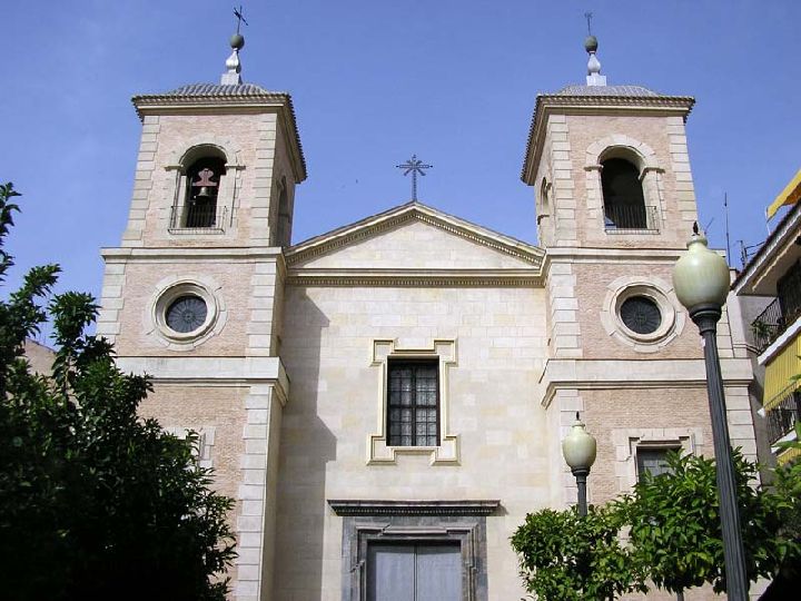 Al exterior, la iglesia presenta una fachada flanqueada por dos torres gemelas. El paño central alberga la portada, sobre la que se abre un gran ventanal, y la fachada se remata con un frontón triangular. La portada se estructura son sencillas pilastras sobre las que corre un arquitrabe, dando la única nota diferencial, los materiales de distinta coloración empleados en los elementos arquitectónicos. La característica dominante en el conjunto es la desornamentación propia del estilo neoclásico de la fachada, atribuida a Ventura Rodríguez.