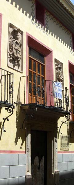 La importante calle Cadenas de Cieza, donde se ubica la Casa, es estrecha, resaltando más su portada barroca y la talla en piedra de sus dos escudos.