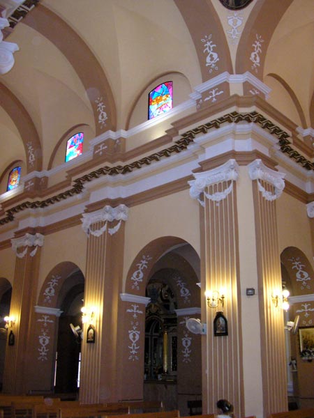 Tiene planta de cruz latina con tres naves; la central más ancha y alta que las laterales, comunicadas entre sí por arcos de medio punto, sobre pilastras jónicas adosadas. En el desnivel existente entre al nave central y las laterales se abren ventanales que proporcionan iluminación natural al espacio interior.