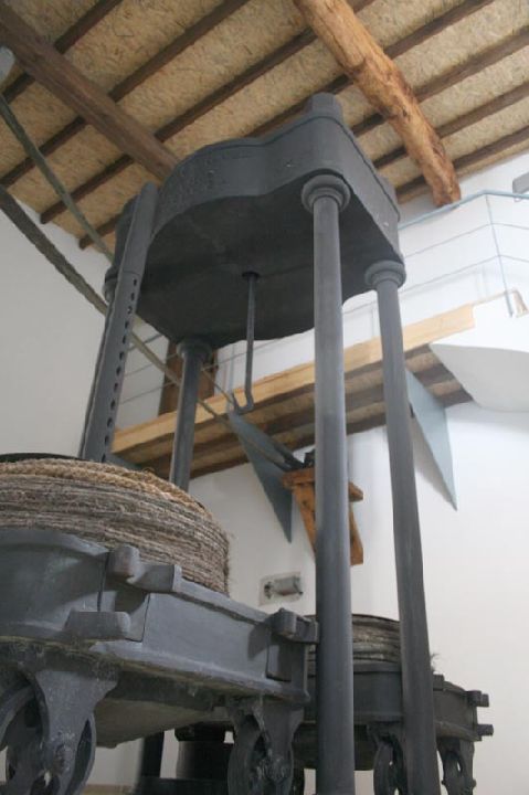 En los molinos arcaicos existía una prensa de torrecilla. Este ingenio consistía en una estructura de recios muros: una torre movible de piedra, atravesada por un grueso tornillo que se movía por medio de grandes palancas, ejerciendo presión directa sobre los capachos de aceituna apilados, sobre una base plana de piedra llamada taza. En el Museo podremos ver como una prensa hidráulica, movida por un motor, ha sustituido a la antigua presa torrecilla.