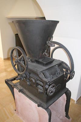 El siguiente paso era el de la molienda. Una vez pesada, los molineros llenaban los canastos de mimbre a paladas. Desde lo alto de la escalerilla vertían la aceituna a la tolva. Esta máquina se encargaba de triturar la aceituna, con objeto de facilitar la salida y separación del aceite que contiene.