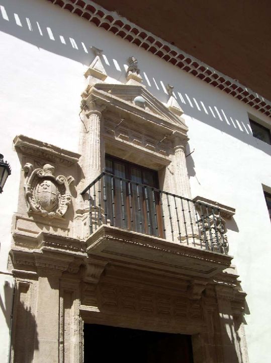 Los escudos de armas que flanquean el balcón, bajo dos segmentos de cornisa, quizá restos perdidos de alguna parte de la arquitectura, dan testimonio de los orígenes nobles de la familia que construyó en su día este palacete.