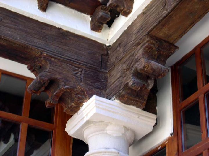 En el interior de este edificio se conservan muchos de los detalles constructivos de la época. Se combinan la piedra y la madera. En la zona baja columnas labradas en piedra blanca sostienen un entablamento de madera y mampostería con pequeñas lomeras adornadas con mensulillas de madera.