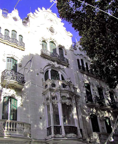 Con un zócalo de mármol y fachada de piedra, dividido en tres pisos, el edificio se emplaza en una zona urbana con edificios anexos, formando parte de la ajardinada Plaza de San Francisco. Sin duda las referencias a la arquitectura catalana y, en especial, a la obra de Gaudí, son continuas y evidentes, si bien en esta obra la libertad de formas del genial catalán se encuentra algo contenida, haciendo uso de una división algo más académica.