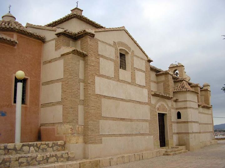 La fachada principal está orientada al Este. En ella una puerta adintelada da acceso a través de un pequeño vestíbulo a la nave de la ermita. Sobre este acceso aparece un óculo que ilumina el interior del coro. Se remata la fachada con una espadaña con campana, coronada por una cruz de Santiago. En la esquina sureste aparece una pequeña hornacina que carece de imagen. Tanto en esta fachada como en las laterales encontramos el paramento revocado y verdugadas de ladrillo.