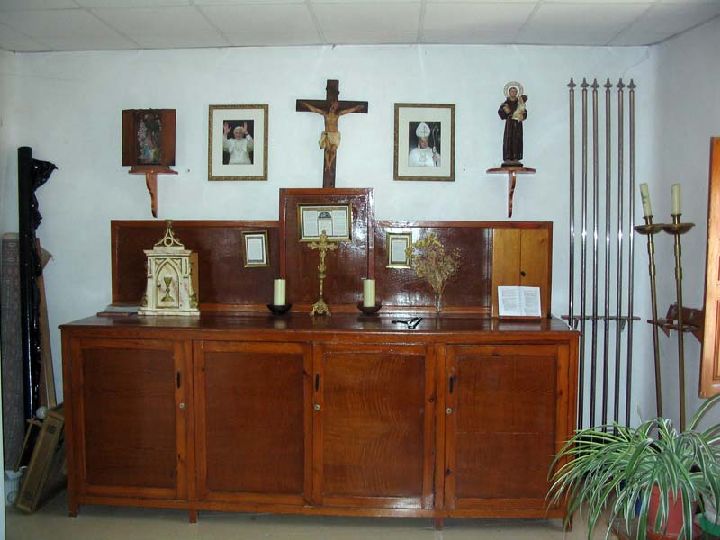 Vía Crucis: mural de pintura sobre cerámica de azulejo. Obra del muralista murciano Antonio Hernández Carpe. Montado sobre una banda horizontal de madera que recorre el lateral derecho. Las tonalidades son azuladas y el aspecto de las representaciones es esquemático.