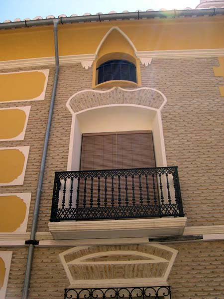 Sus balcones y ventanas distribuidos en armonía, se lucen con hermosa rejería de forja. No le faltan líneas curvas y rectas para enmarcarlos, y el color blanco y amarillo contrasta con el del ladrillo.