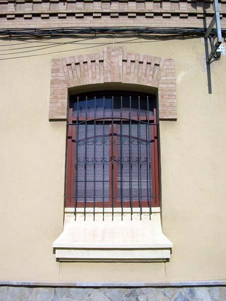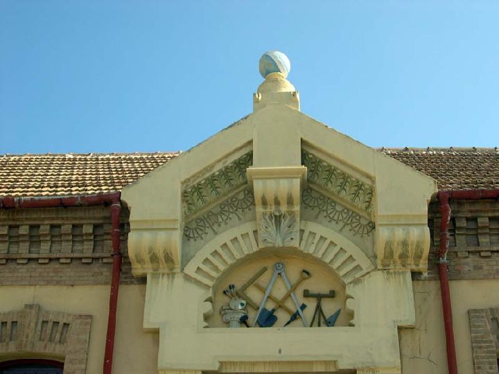 Lo que sin duda llama la atención de esta arquitectura es la decoración de la puerta principal. Se trata de un dintel en piedra cuyas proporciones respecto al resto de la obra pueden resultar exageradas. Una especie de frontón triangular, de marcado estilo modernista, coronado por una esfera de tonos azulados ¿bola del mundo-, encierra una muestra de los útiles representativos del trabajo obrero y artesanal. La implicación del arquitecto en este proyecto es muy significativa, puesto que quiere destacar el destino de su proyecto y dar protagonismo a la escala social que se va a servir del mismo.