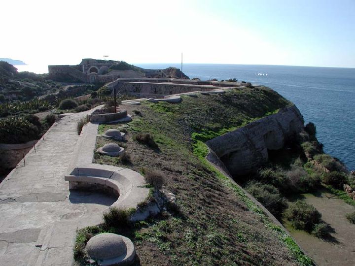 En la gola de cada una de las casamatas se dispone una gran puerta destinada a la evacuación correcta del humo producido por los disparos de los cañones en su interior. Tras esta trasera se sitúa un edificio, semienterrado, destinado a polvorines, repuestos, alojamientos y otras dependencias, comunicado a uno y otro lado a través de túneles. Es adyacente a este módulo donde aparecen los elementos destinados a la defensa terrestre de la batería, entre los que destaca una caponera preparada para el uso de fusilería, en una disposición que algunos autores han calificado como frente atenazado.
