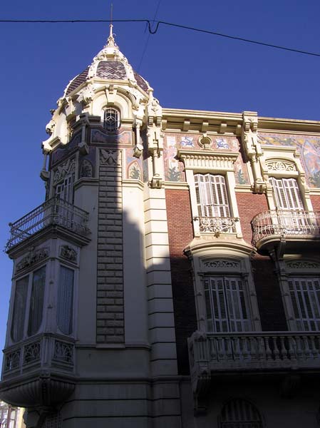 Este edificio consta de semisótano, entresuelo, dos pisos y ático. Con dos fachadas que dan, por un lado, a la histórica Plaza de la Merced y, por otro, a la no menos histórica Calle San Diego. Nos encontramos con una de las fachadas achaflanadas más destacadas de Cartagena, distinguida de manera especial por una cúpula decorada con escamas de cerámica vidriada de color dorado y una decoración típicamente modernista que la entronca con el estilismo de la escuela catalana del momento.