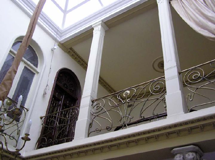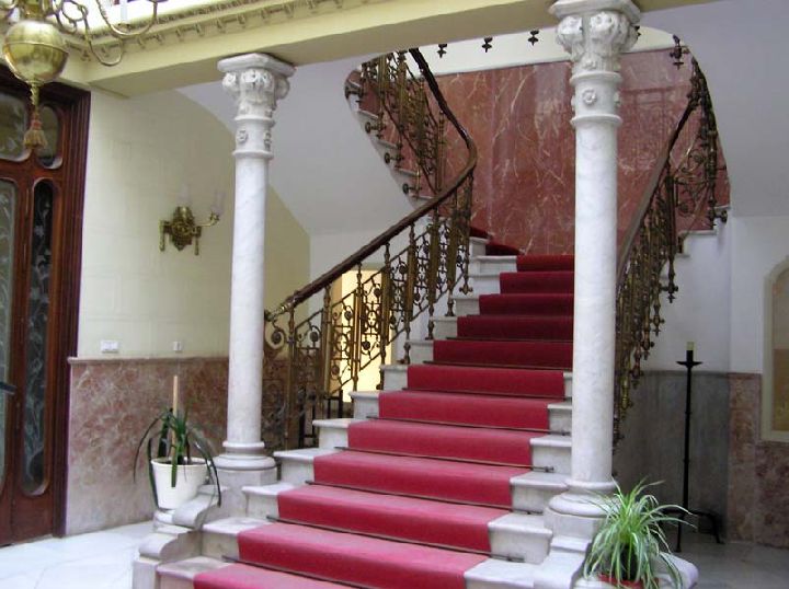 La escalera del vestíbulo da paso, a través de unas puertas acristaladas, a un patio interior iluminado desde el techo, con lucernario y presidido por una escalera de mármol. Esta escalera, con dos elegantes columnas en el comienzo de su subida, está decorada, en su baranda de hierro, con sencillos motivos florales.