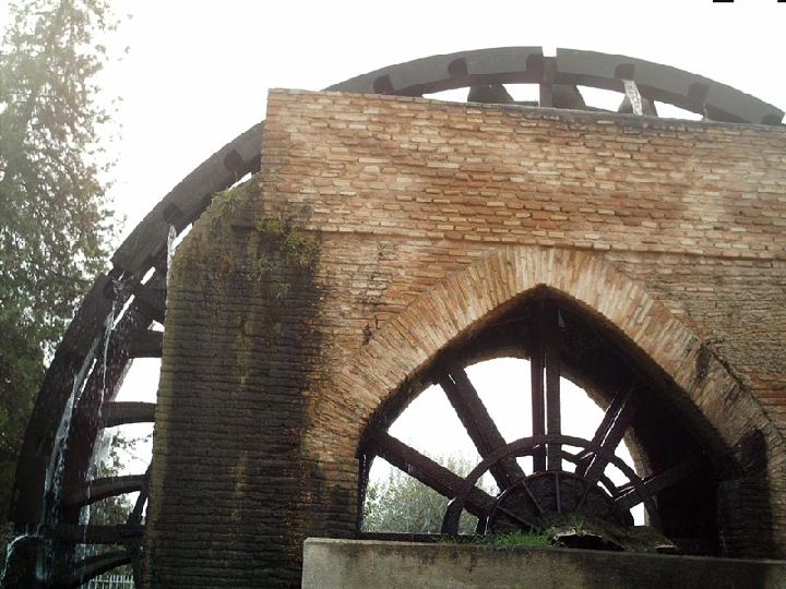 La noria primitiva tenía travesaños de madera que no formaban ninguna forma geométrica y cangilones de cerámica que acarreaban el agua a su paso por la acequia, vertiéndola sobre un canal cuando comenzaban a bajar.