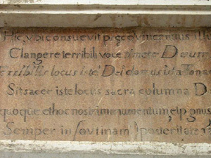 La esquina que da a la actual Glorieta de San Vicente tiene adosada una columna miliaria con inscripción, sobre la que se halla situada una estatua de San Vicente Ferrer.