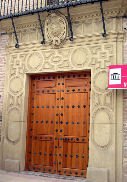 La puerta de acceso está realizada en madera, enmarcada en piedra con hermosas decoraciones, y sobre ella el escudo de armas de los Marqueses de Espinardo.