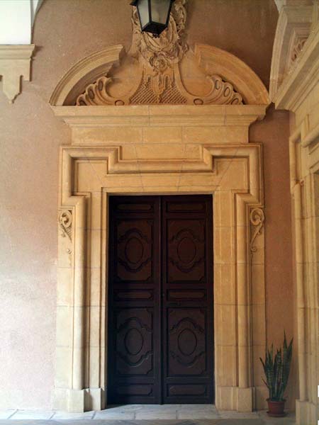 Las fachadas se encuentran ricamente decoradas. Ambas están formadas por tres bandas superpuestas de color rojizo separadas entre sí por molduras. En la fachada principal se dispone una gran portada central cuyo vano está ligeramente abocinado y flanqueado por pilastras jónicas decoradas con emblemas episcopales y escudos circulares en su parte central. Coronando esta portada se encuentra un gran balcón donde el elemento decorativo más destacable es el gran escudo del Obispo Rojas y Contreras.