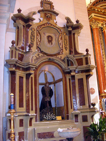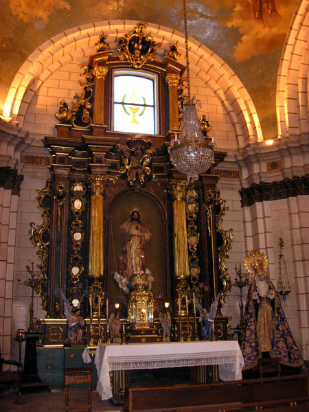 Este retablo de estilo neoclásico, estuvo anteriormente adosado en el muro que contiene el acceso a la sacristía. Queda desproporcionado por su escasa altura con relación al espacio que lo contiene, razón por la cual se añadieron dos figuras (ángeles) de escayola y un elemento central, el Espíritu Santo.