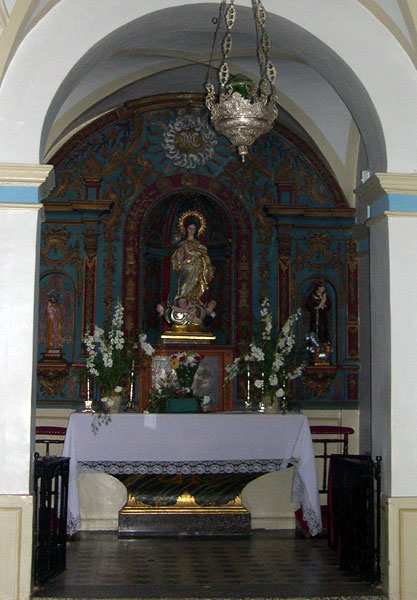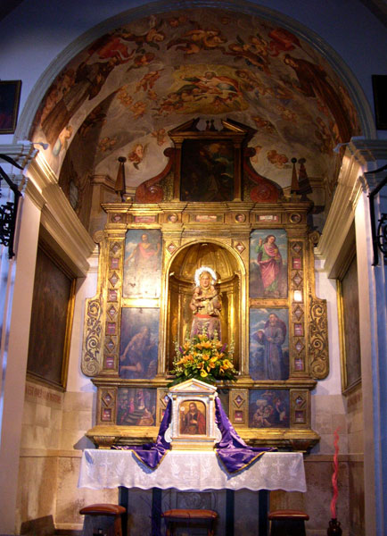El retablo del altar mayor está presidido por una imagen de la abuela Santa Ana del siglo XV. Contiene ocho tablas. En el ático, sobre la imagen del niño de Santa Ana, la Impresión de las Llagas de San Francisco. A la izquierda del que mira el retablo, San Juan Bautista y debajo de él, San Jerónimo en la cueva de Belén, de rodillas, con la piedra en la rodilla derecha. A la derecha del que mira, con el Cáliz y el escorpión saliendo del Cáliz y debajo el Doctor San Buenaventura en contemplación. En la predela hay dos tablas pintadas con motivo de la vida de Santa Ana, Natividad de la Santísima Virgen y Presentación de María niña al Templo.