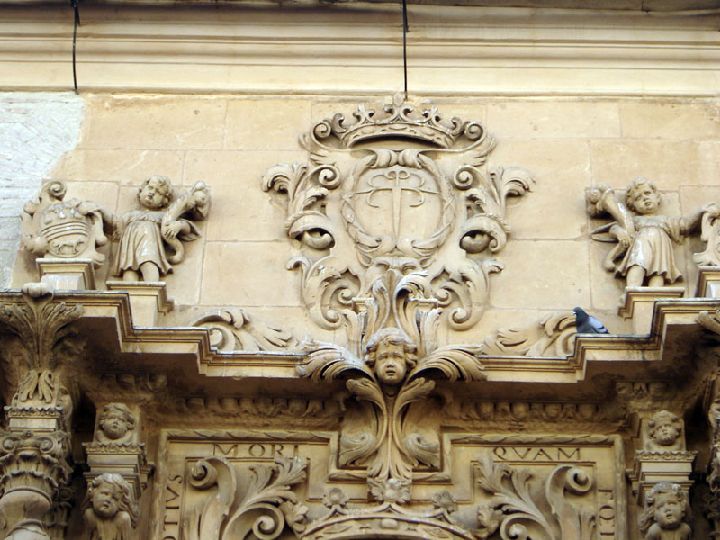 Todo el conjunto está rematado por el escudo de la Orden Militar de Santiago, que se encuentra flanqueado por los escudos pertenecientes a los apellidos de la esposa. La ornamentación de la portada queda completada con las figuras de niños, angelotes, guirnaldas, trompetas, frutos, conchas y garzas. Esta portada ha sido atribuida al escultor Jerónimo Caballero.