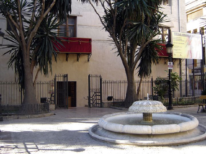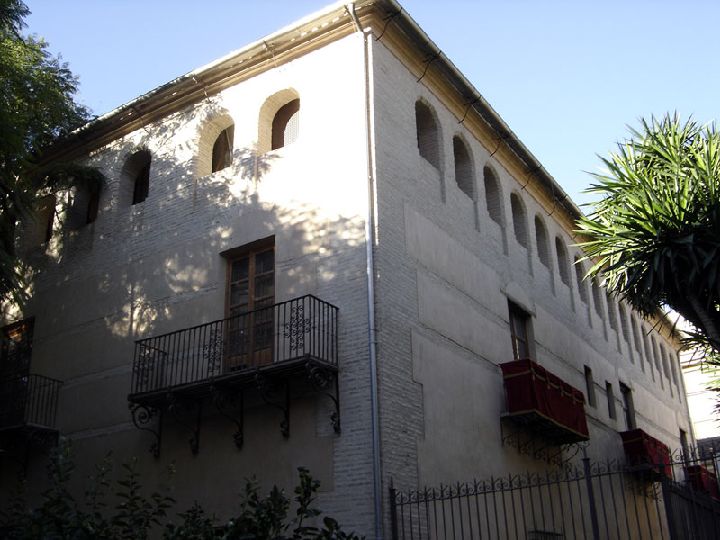 El resto de la fachada queda ordenado de forma simétrica respecto a esta portada. En la segunda planta, a ambos lados de ella, se sitúan dos balcones simétricos realizados en un bello trabajo de forja que cierran las dos grandes ventanas de este piso. En el último piso se sitúan, también de forma simétrica, seis pequeñas ventanas a cada lado, realizadas en ladrillo con forma de arco de medio punto.