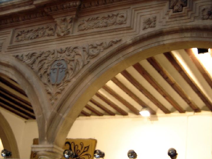 El interior queda distribuido en torno a un patio de planta cuadrangular con arquerías formadas por ocho columnas de orden toscano, y cuyos arcos están perfilados con molduras y cornisas quebradas. El claustro está decorado, igual que la portada exterior, con los escudos de los apellidos del matrimonio, obra del cantero Pedro Sánchez Fortún.