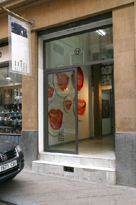 La sobria fachada consiste en una cristalera serigrafiada con el logotipo y nombre de la galería, que deja ver el interior de la exposición claramente orientada hacia la calle.