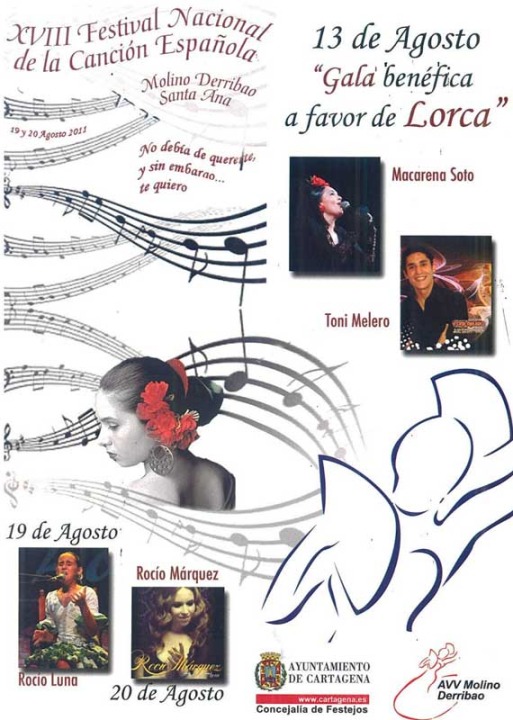 La localidad cartagenera de Molino Derribao acoge un año más el Festival Nacional de la Canción Española, que celebra su décimo octava edición los días 19 y 20 de agosto, y que además contará con una gala benéfica previa a favor de Lorca, que tendrá lugar el sábado 13 de agosto.