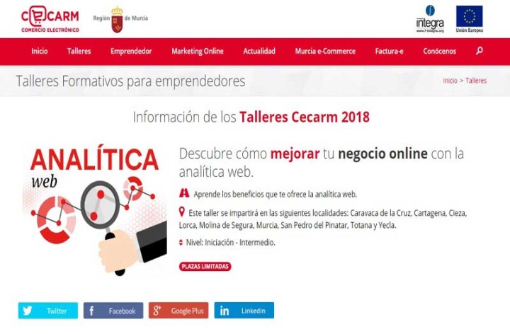 La Comunidad imparte un nuevo taller gratuito sobre las herramientas de analítica web aplicadas a la gestión de un negocio online. La asistencia es gratuita y para participar solo es necesario inscribirse en la página web http://www.cecarm.com/talleres.