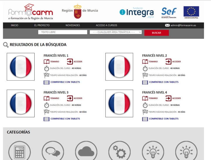 La Comunidad ha publicado hoy su segundo curso ‘on line’ y gratuito del nivel A2 de Francés, a través de la plataforma formativa Formacarm, y con una financiación de 30.000 euros por parte del Servicio Regional de Empleo y Formación (SEF). Se trata de la segunda de las dos partes que constituyen este nivel del Marco Común Europeo de Referencia para las Lenguas. Hasta ahora, Formacarm contaba con dos cursos de Francés que abarcaban el nivel A1, y con la primera parte del nivel A2, que ahora se completa.