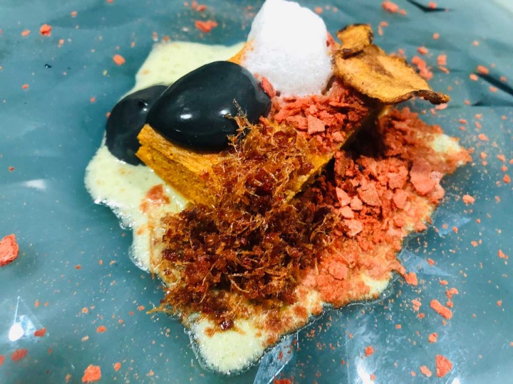 Para la edición en curso, el cocinero de Aracena ha presentado ‘Murcia 2020’, dedicado a la Capital de este año. Se trata de un bizcocho de michirones sobre emulsión de zarangollo, tierra de tomate, tapenade de aceituna negra y atún, espuma de cebolla, chip de berenjena y sal de jamón.